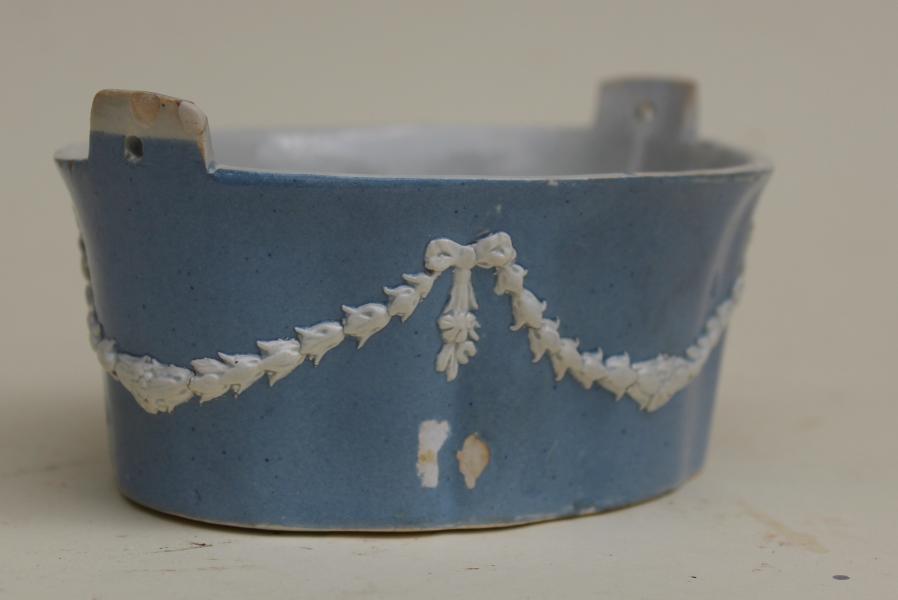 an early nineteenth century English pearlware (Perhaps Leeds) butter tub c1810-25. The form rather charming and moderately unusual, the oval body applied with very crisply moulded swags of husks, issuing from ribbon tied floret pendants reserved against a powder blue ground with two integral angular handles as shown. The piece measures 5 7/8 inches long, is 4 3/8 inches wide and stands 2 5/8 inches tall. Condition: excellent, one handle with a small shallow chip and a tiny touch in, two minute chips to rim, otherwise excellent and as clearly pictured (occasional small frit to ground colour |