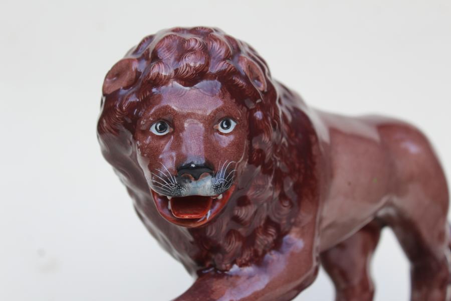 A wonderful and rare late 18th or very early 19th Century pearlware figure of a lion. Probably Staffordshire. His front paw on a globe although interestingly the islands illustrated do not conform to the earth. The whole on a fo-marble base. I must say the painted detail on this is as good as any thing I have seen in Staffordshire figures.