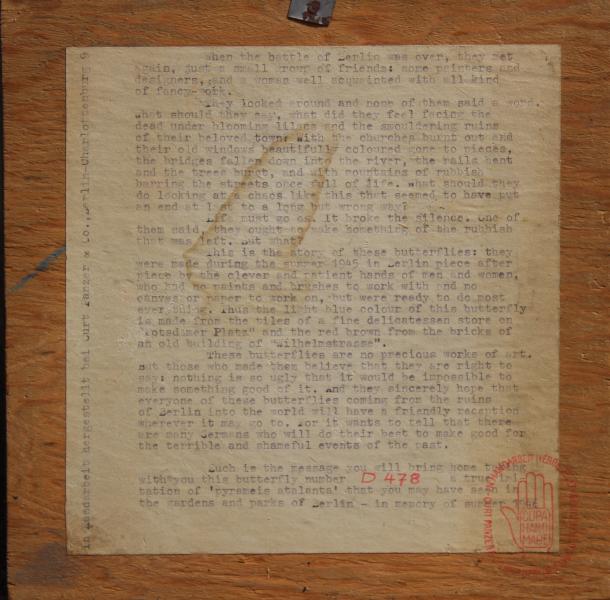 : : : This is the story of these butterflies: they were made during the summer 1945 in Berlin piece after piece by the clever and patient hands of men and women, who had no paints and brushes to work with and no canvas or paper to work on, but were ready to do most everything. Thus the light blue colour of this butterfly is made from the tiles of a fine delicatessen store on "Potsdamer Platz" and the red brown from the bricks of an old building of "Wilhelmstrasse".