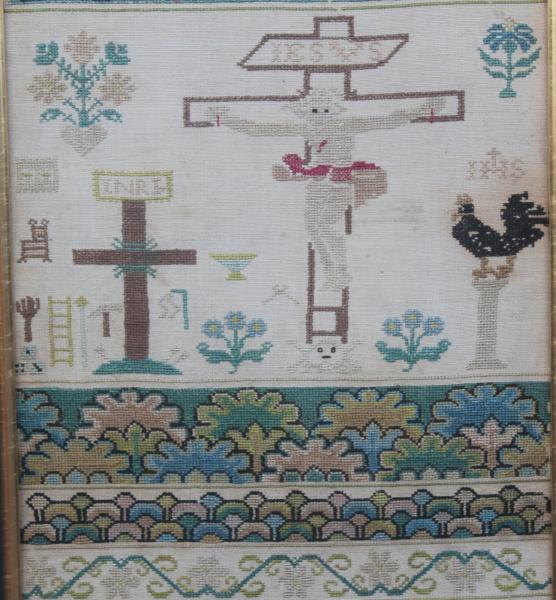 A stunning mid 18th century German band sampler worked with various biblical scenes including a central crucifixion, Jacobs Dream, Shepherd and a large pear tree. Signed CSB and dated 1758.