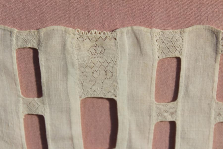 Hollie point has always been more or a domestic, rather than a professional. It was used primarily on baby clothes in the 18th and early 19th century, especially, christening sets. The lace was stitched in the crown of baby bonnets, or caps, and sometimes on a band that extended from the centre front of the cap to the nape of the neck. The shoulder seams of small shirts were decorated with initials, dates, and mottoes as demonstrated on this sampler. Signed and initialed S D 1716 to the top central panel with a variety of motifs in the linking panels.