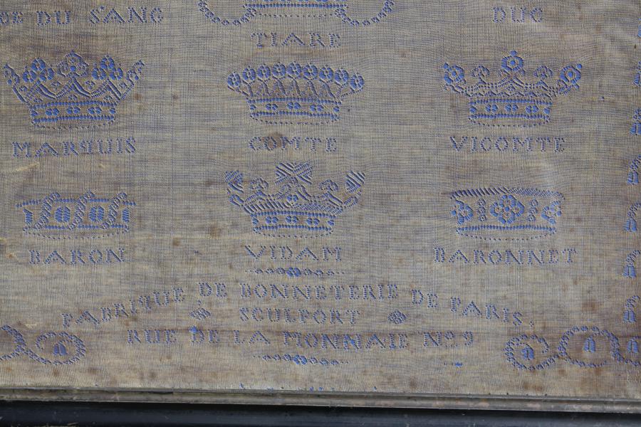 We have never seen a sampler like this exceptional whitework. Signed AH and dated 1857 it is inscribed FABRIQUE DE BONNETERIE DE PARIS, SOUTFORT, RUE DE LA MONNAIE No.9 (PARIS HOSIERY FACTORY, SOUTFORT, RUE DE LA MONNAIE).