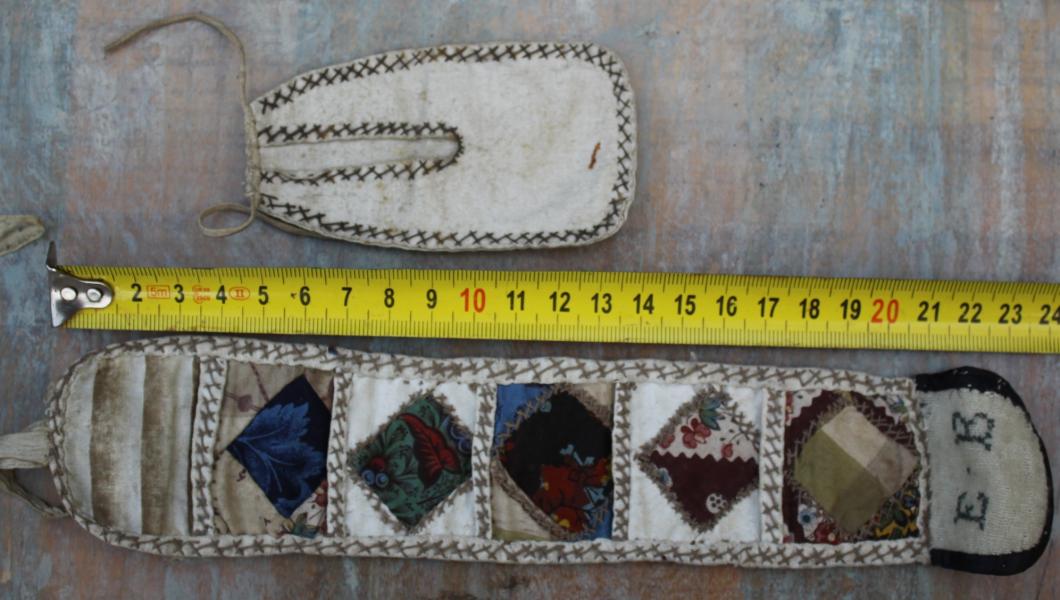 Georgian England the fashionable women's dress had no pockets, so the were an addition that was when required tied around the waist. We personally have never seen a smaller example, probably made for a doll .