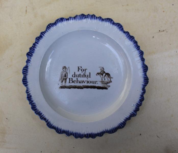 A wonderful early pearlware plate with blue feather edge. Transfer printed to the center with "FOR DUTIFUL BEHAVIOUR" for performing the duties expected or required of one ! I'm not sure that this required a reward , a bit like tipping your hair dresser for doing a good job, or the taxi driver for driving you to your destination safely !. |