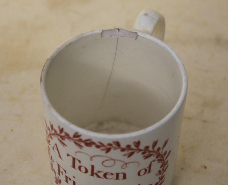 Condition crack near handle and associated chip, crack through base of handle. fine hairlines in base. |