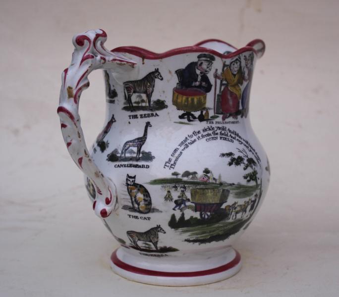 An interesting dated (1835) jug, Although the named animals are recorded earlier on pots circa 1820 it is an early date for the three round prints CORNFIELD, FARMYARD & SUMMER AND I'm surprised that they were still calling a Giraffe a Cameleopard at this date. Obviously copying an old print. Probably made in the North East.