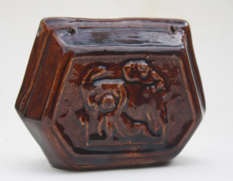 Produced in a treacle glaze possibly by the wooden box factory with raised fielded panels to each side. suspension holes for a hanging cord just help.