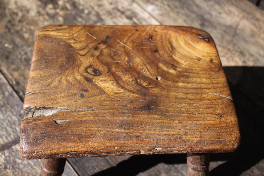 What makes a perfect stool, character ! this one stands straight but look at those legs, three short and one long, with a great piece of wood on top.