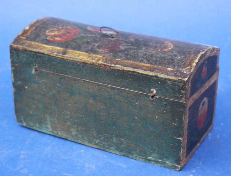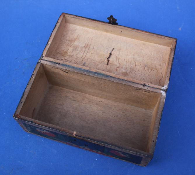 This has an unusual bird on the lid, rather than the flowers and fruit, that appear on the front great small size with original metal work.