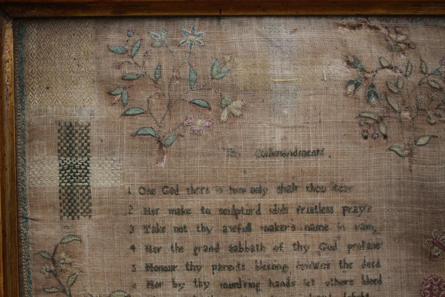 A rare and unusual 18th century Norfolk School Darning sampler with a central verse/ The Ten Commandments.