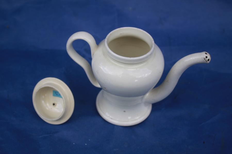 A rare late 18th century creamware child's feeder. Of inverted baluster form. The slender curved spout with pierced end and ear shaped handle.