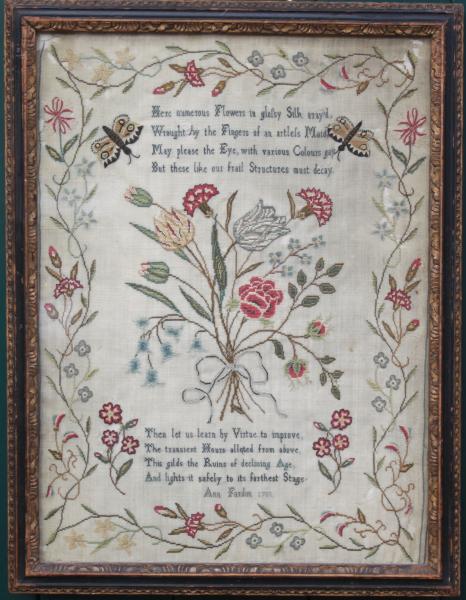 Mary & Ann were the daughters of John Fardon II, the famous Clock Maker from Whitney / Deddington in Oxfordshire. Born in 1736, he had a number of problems with The Quaker Friends, finishing in 1767 when it was discovered that John had married Mary Grange in 1756. This had taken place at the Savoy Palace Chapel and not in the meeting house, this did not comply with the Bishops Licence required by law so was deemed illegal. In effect the annulment of the marriage left John a single man to remarry Sarah Cox in 1772 neither now Quakers. His wife Mary remained in Deddington died in 1784 and is buried in the Quaker ground at Adderbury. (It is interesting to see that a number of his clocks did not follow a Quaker tradition, which may explain the non Quaker nature of these samplers).