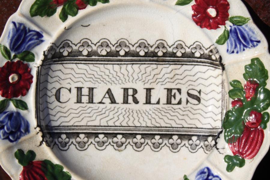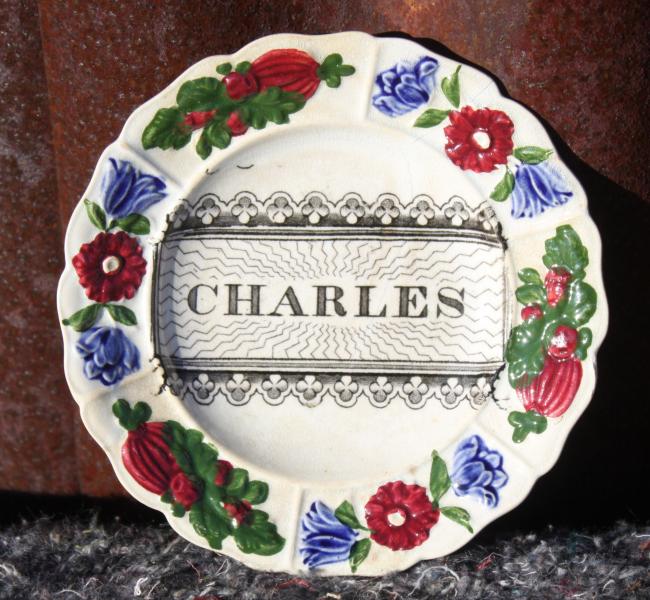 This is a lovely small ( 11cm diameter) creamware child's plate by Rogers of Longport, Stoke On Trent in Staffordshire. It is impressed ROGERS which was the mark used by the factory between 1784 & 1814 although it is believed that it may have been used until 1836. It is moulded with sprigs of flowers picked out in red, green and blue and has a central transfer printed name ROBERT.