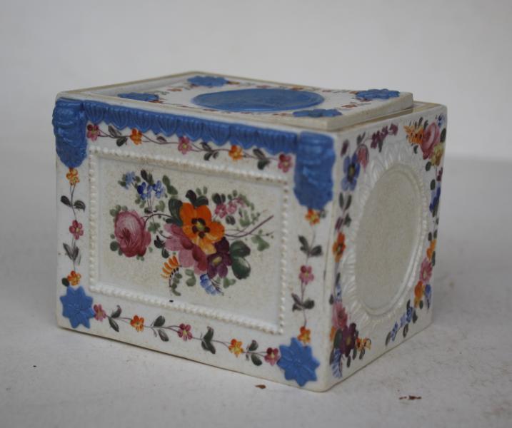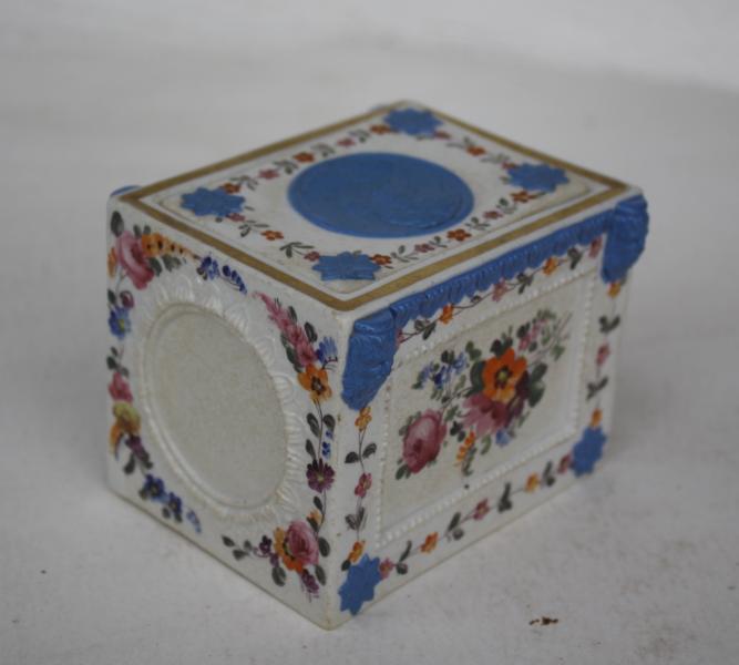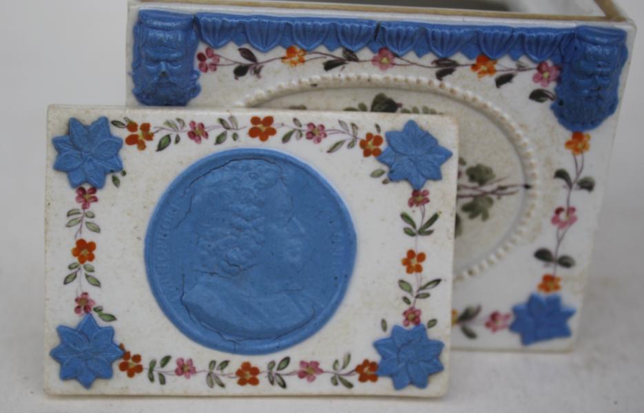 An interesting "Castleford" white stoneware box with a portrait medallion of Christopher Columbus, enamel flower decoration and gilt edge. circa 1820.