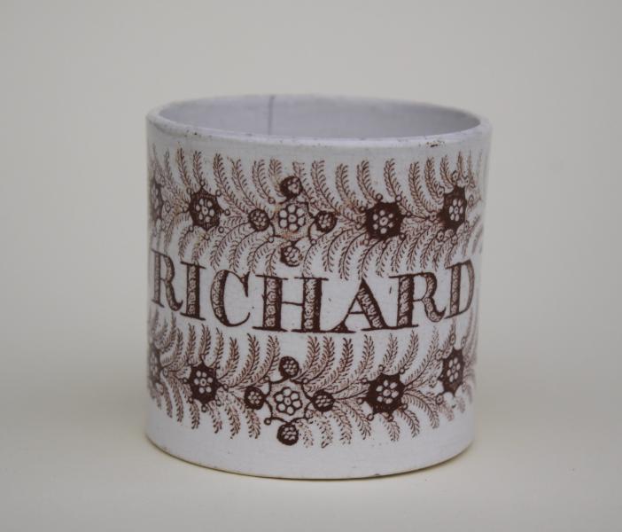 A very uncommon name on early children's ware. Transfer printed in brown with a fern / feather border.