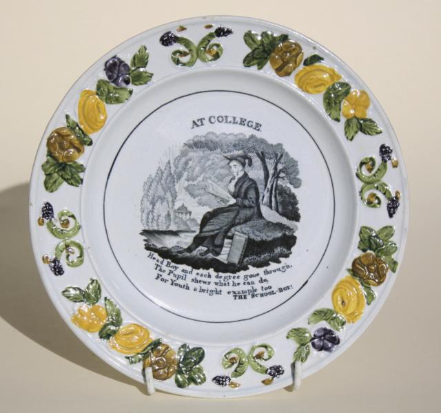 A wonderful early 19th century child's plate depicting a University student seated reading the latest paper. In the background the sun rises (A new bright start) over a classical building.