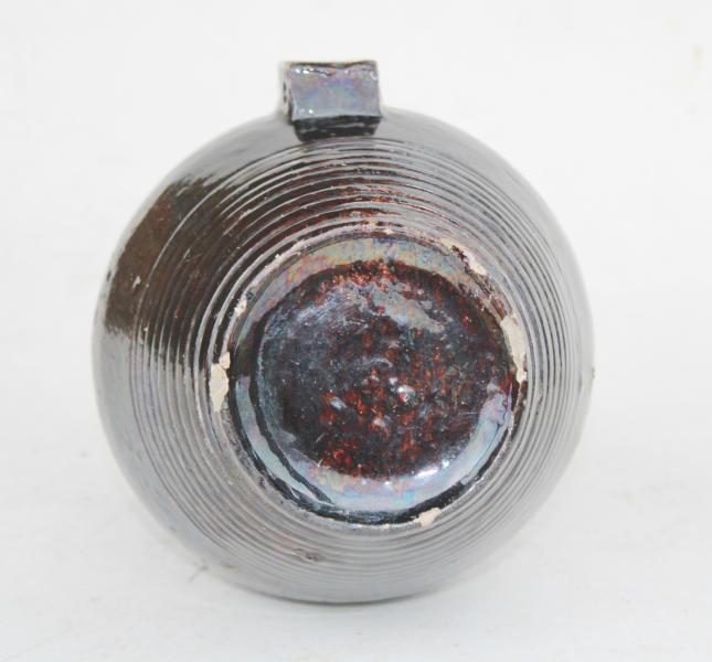 Wonderful deep brown almost Black glaze of this costrel barrel makes it stand out .