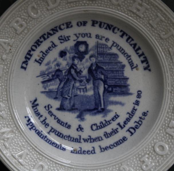 Mid 19th century Childs plate that we have not seen before. Molded Alphabet border and central print IMPORTANCE OF PUNCTUALITY.
