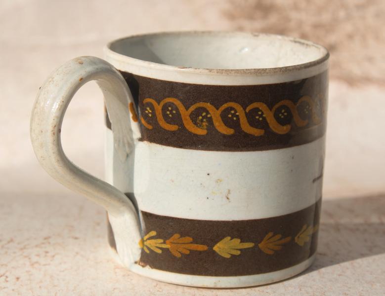 A wonderful early childs mug decorated with two bands of brown slip decorated in Pratt colours and the inscription A GIFT FOR PETER.
