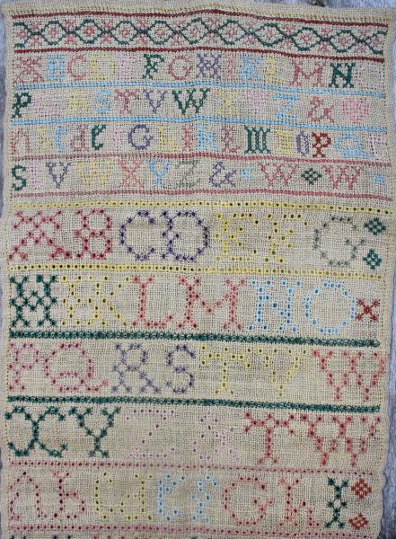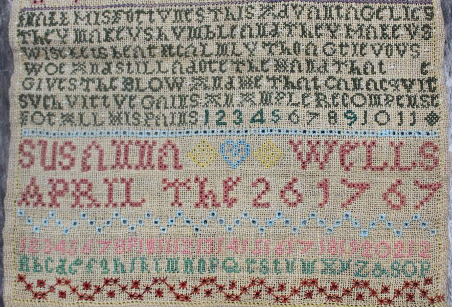 A wonderful mid 18th century band sampler by Susanna Wells finished April 26 1767. Decorated with verse, alphabets, numbers and motifs, 52cm x 21cm in totally original, never been framed condition.