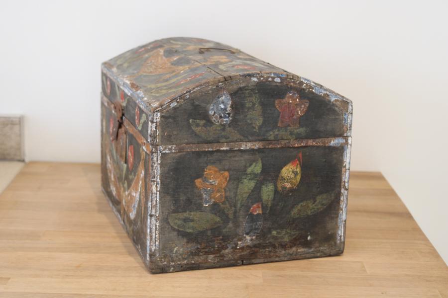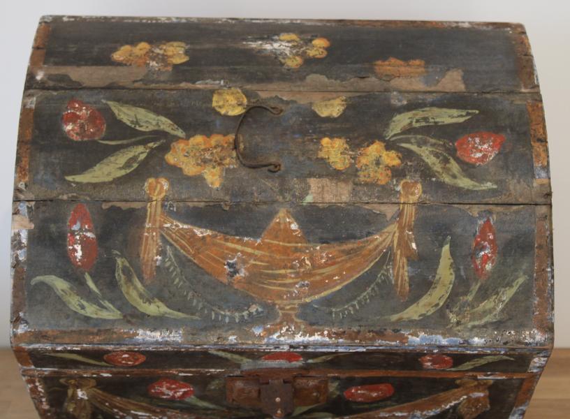 A good early 19th century Normandy marriage box decorated with naïve swags and flowers against a dark blue ground.