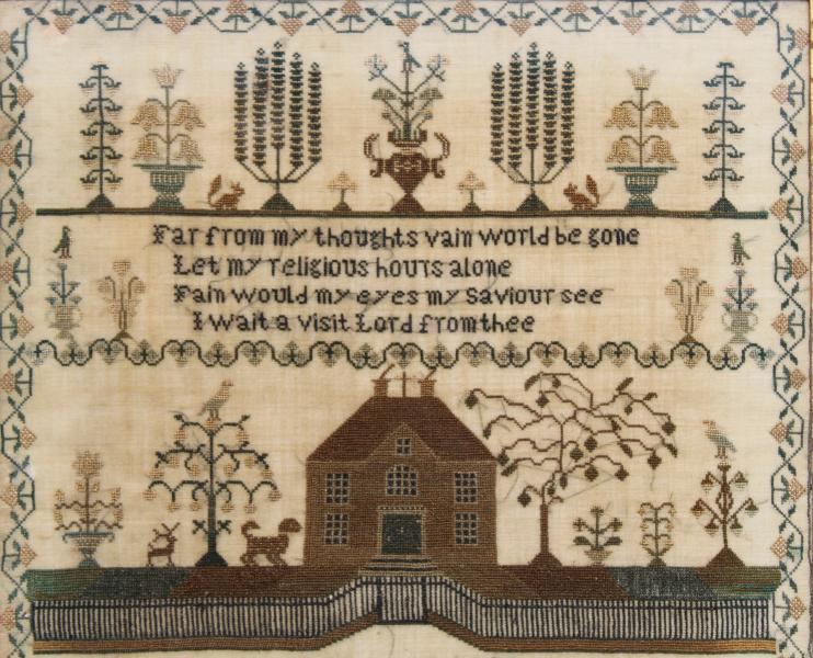 Mary Ann worked her sampler with a classic large central house with grass frontage and picket fence. Numerous trees and flowering plants fill the sampler as well as birds and insects including a large moth that balances the Hot Air Balloon in the bottom right corner.