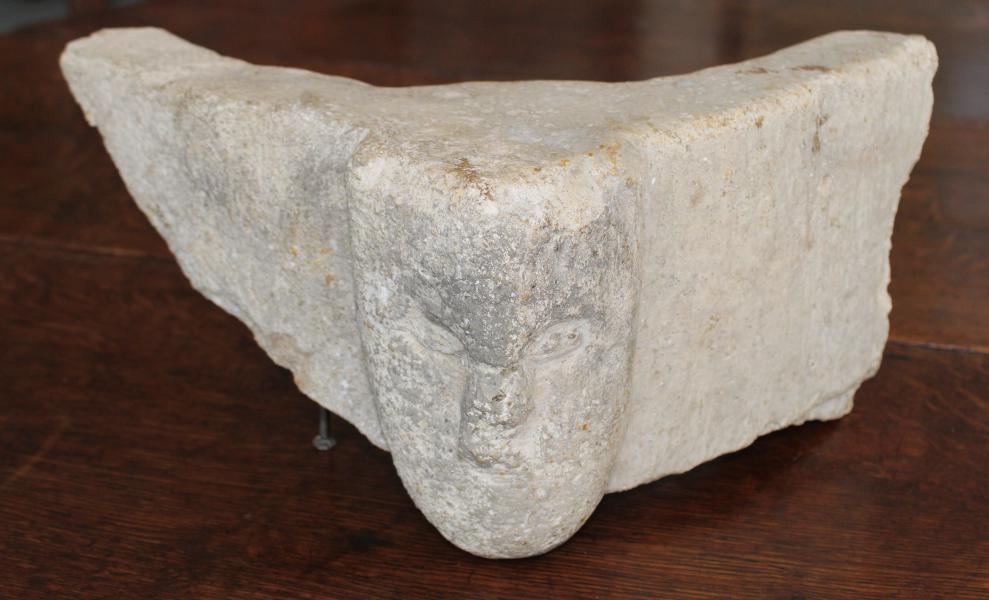 An important Romanesque Holy water stoup fragment depicting The Kings Head.
