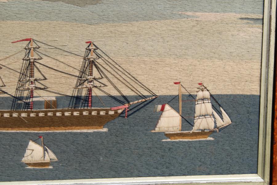 A good 19th century sailors needlework picture depicting a number of ships off Portsmouth, including a French boat.