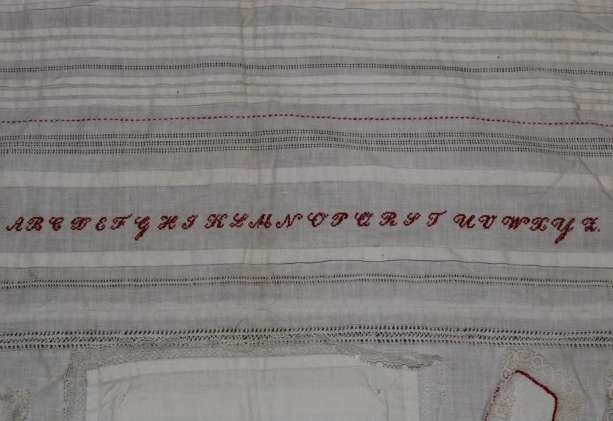 An interesting and unusual late 19th century School sampler by Anna Meyer , "Made at the Boarding School Gyseghem" .