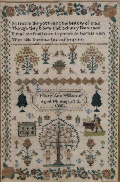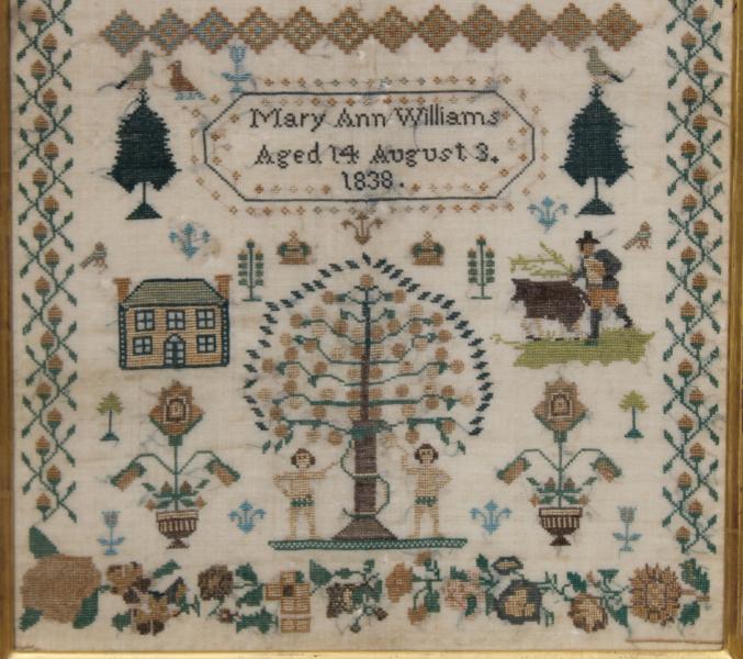 A delightful sampler that has it all, a different border has been worked across the top & bottom to the sides, a short verse across the top and numerous spot motifs. At the bottom a large Adam & Eve stand beneath the apple tree that its self has a garland of leaves over it. Either side a red house and a farmer with his cow, possibly a representation of Mary's home and fathers work.