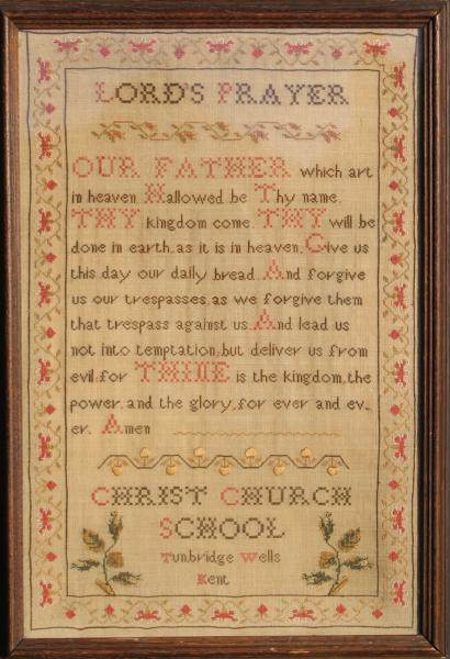 This unusual sampler was possibly done by a teacher or a group of children in the early years of the school as a teaching aid and "poster" demonstrating the standard of work achievable in the New School. |