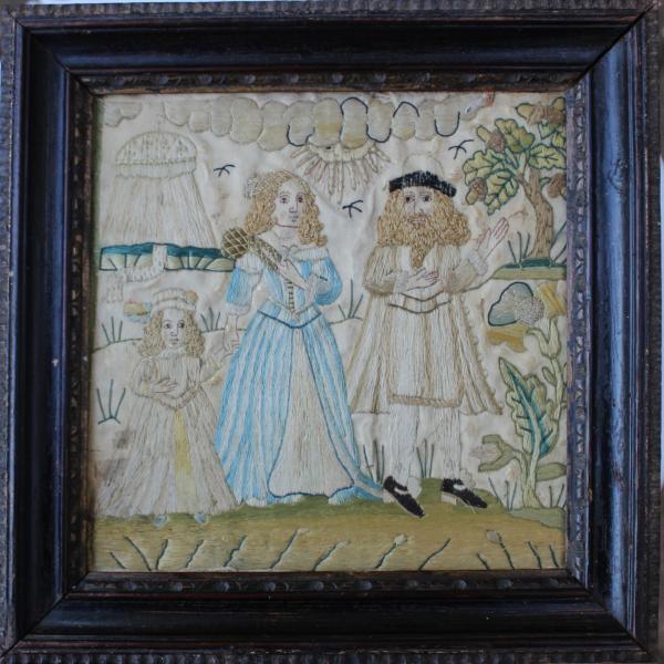 A charming 17th century silk needlework depicting a family.