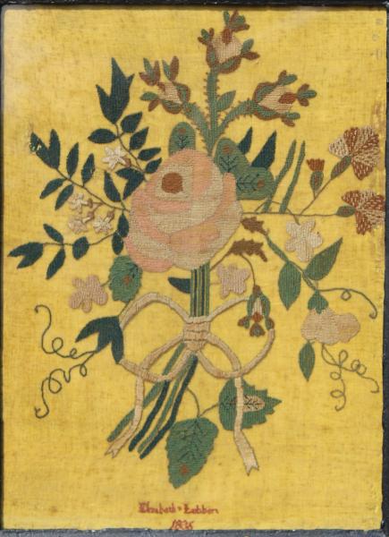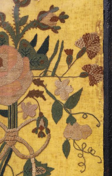A very unusual sampler depicting a bouquet of flowers worked in a variety of stitches on a yellow coloured ground, highlighted by the yellow background card.