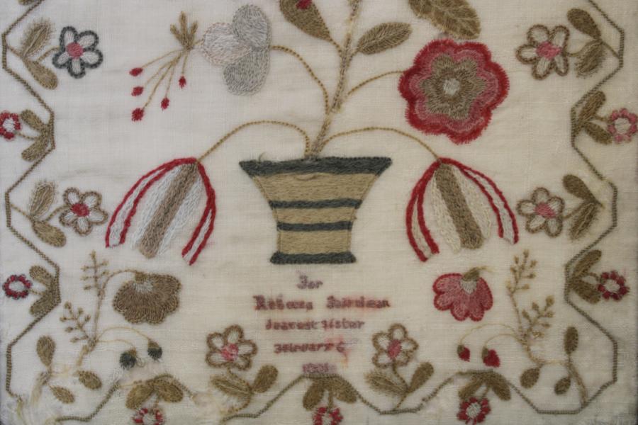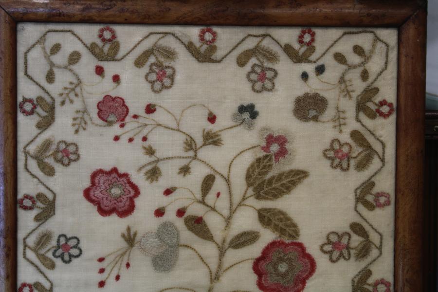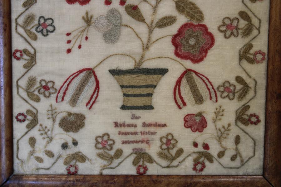 One of an interesting group of samplers worked in this way, that can also include central panels in Quilts. We have as yet not tracked down the area they were made but possibly Lancastershire or at least Northern they all shred a wonderful freedom of expression in there style.