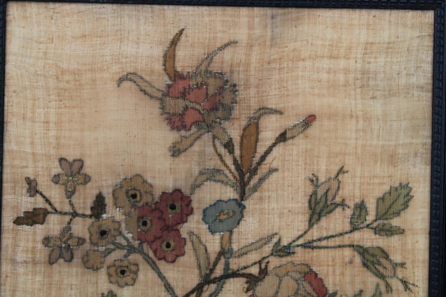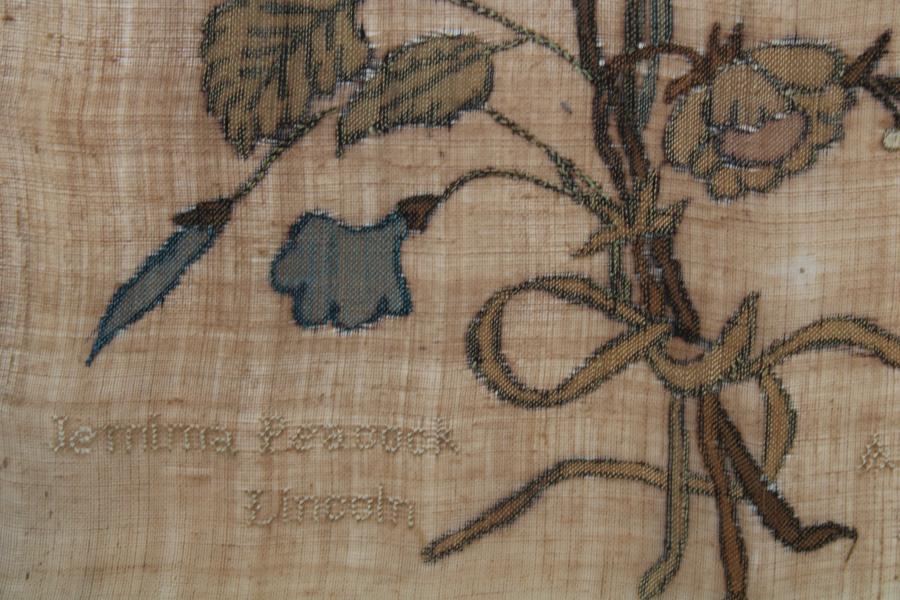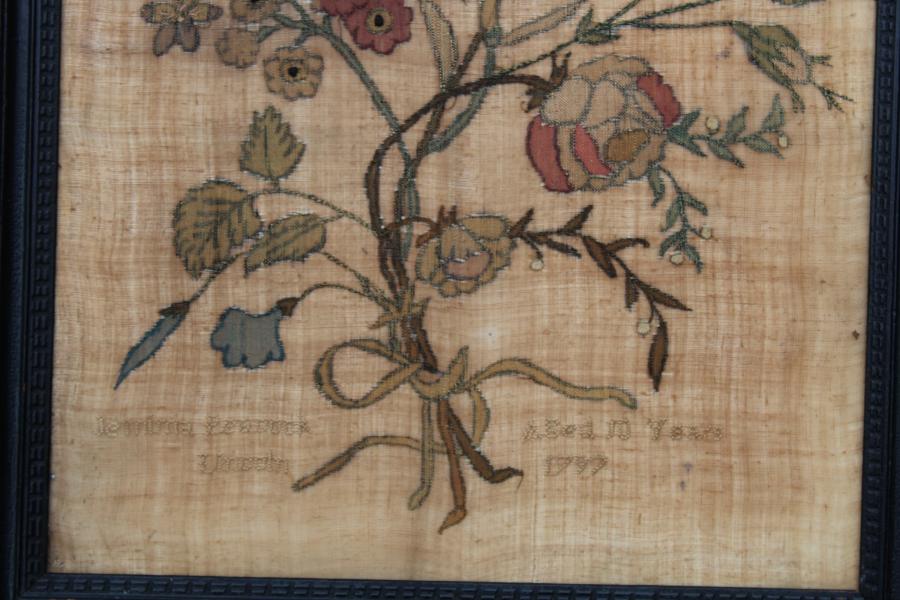 A wonderful late 18th century darning or repair sampler. Although not stitched in darning patterns Jemima has cut out shapes in the ground fabric and replaced them with pieces of silk fabric. Occasionally stitching over to create a variety of flower types held together by a ribbon .