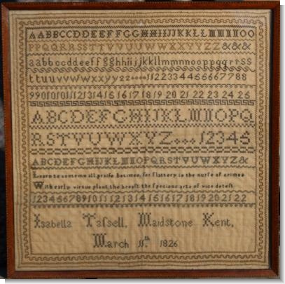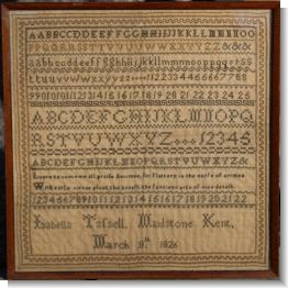 A classic school sampler worked in a traditional style with bands of alphabets and numbers with a different border pattern between. Signed across the bottom ISABELLA TASSELL, MAIDSTONE KENT March 11.1826.