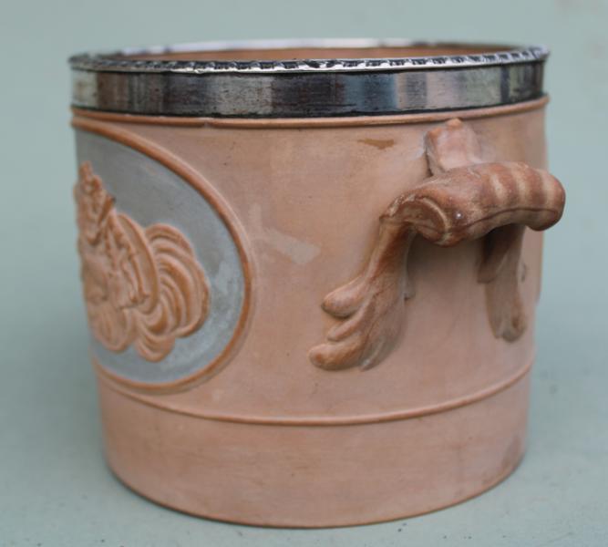 The "old Sheffield plate" rim , by Robert Gainsford ( his mark clearly placed central above the classical vignette) an integral part of the design protecting the pot from chipping against the harder wine decanter.