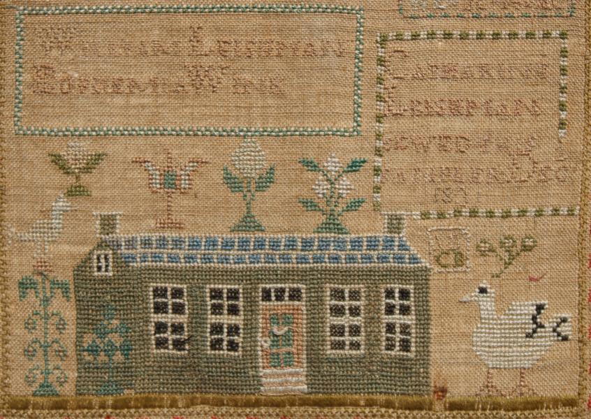 Framed in a period maple frame measuring Her sampler depicting a large house with an out size duck. |