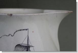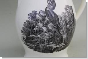 It is interesting that the Hero that was General Wolfe died taking Quebec City in 1759 and yet the commemorative pottery was not produced until much later !. In fact the original painting by Benjamin West was exhibited in 1771, and the print on which the jug is based was engraved by W.W.Woollett and published J. 1776.... they moved at a slower pace. The characters at his side include Robert Adair (holding his handkerchief to Wolf's heart), Captain Harvey Smith , Colonel Isaac Barre, Colonel Williamson & Lieutenant Henry Browne were not present at his death, but hay no need to spoil a good picture.