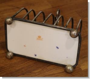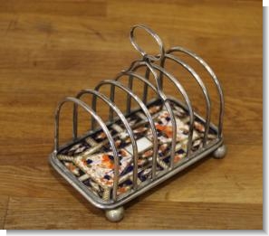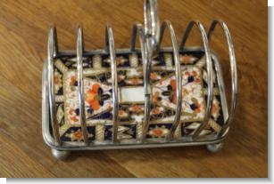 Not something I have seen before, a 19th century English Porcelain Toastrack with silver mounted frame. The base plate by Davenport in Imari pattern has both an impressed DAVENPORT and Printed factory marks.