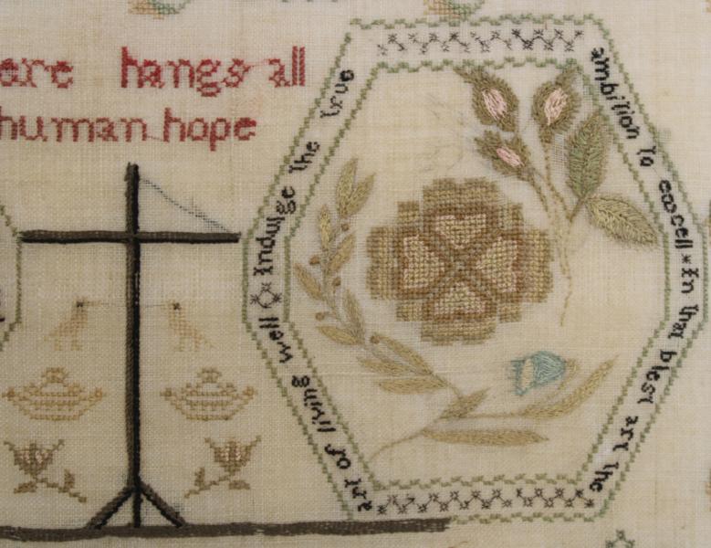 At the top a pair of hexagonal panels with short statements of virtues, have not only flowers stitched but the pencil drawings our Elizabeth had made before stitching her sampler.