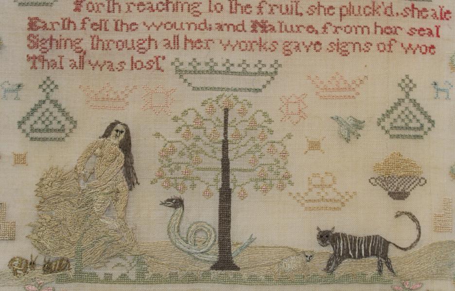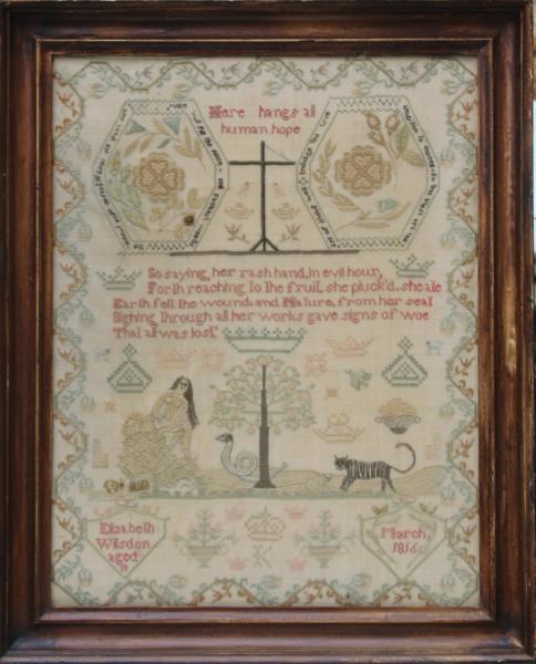 A beautiful and delightful early 19th century silk sampler depicting the story of Eve taking the apple in the garden of Eden. Or at least the garden as she saw it with her large pet cat (or Tiger) small lamb and a pair of pet rabbits.