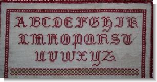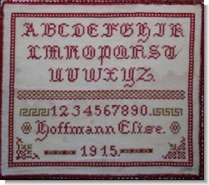 A striking early 20th century German sampler worked in the traditional style of alphabet followed by numbers with the sewers details Elise Hoffmann and date 1915 following .