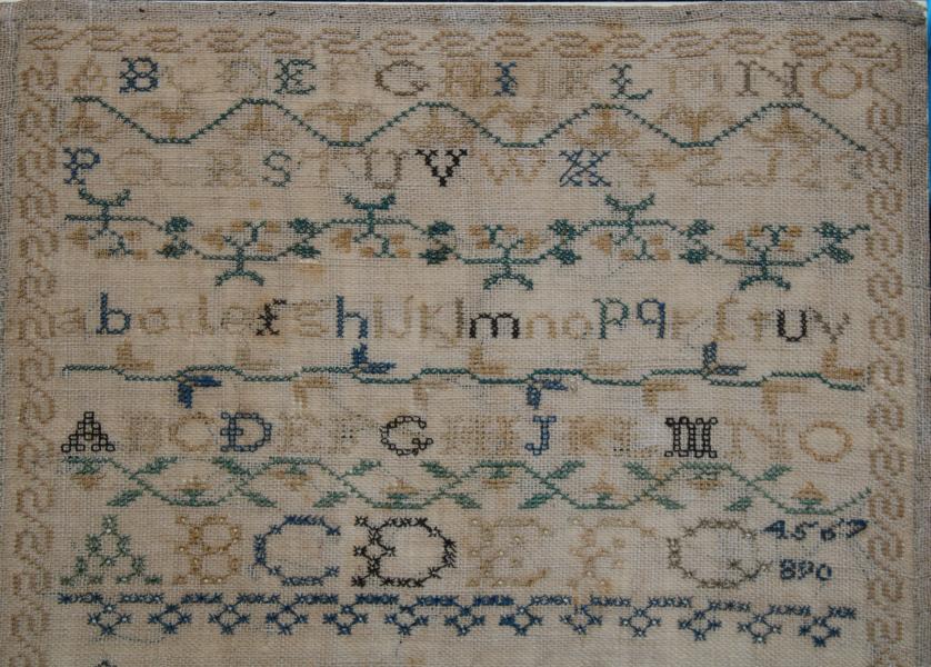 A simple border contains the alphabet in both upper (2 styles) and lower case letters with numbers 1 to 10 filling the end on rows, amusingly 1,2,& 3 on the second row the rest squashed at the end of the bottom band).