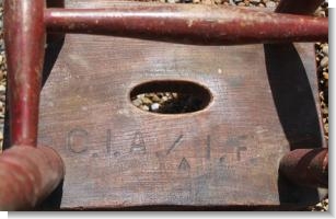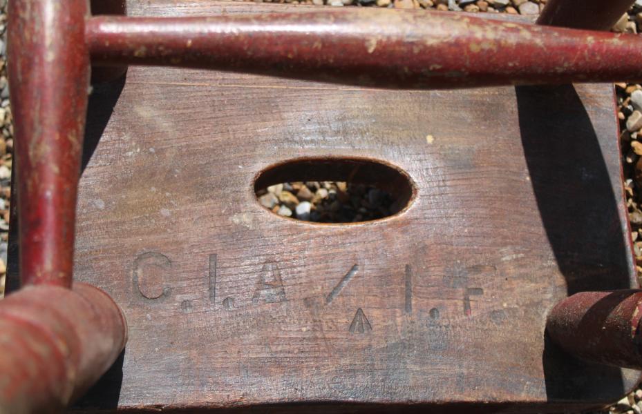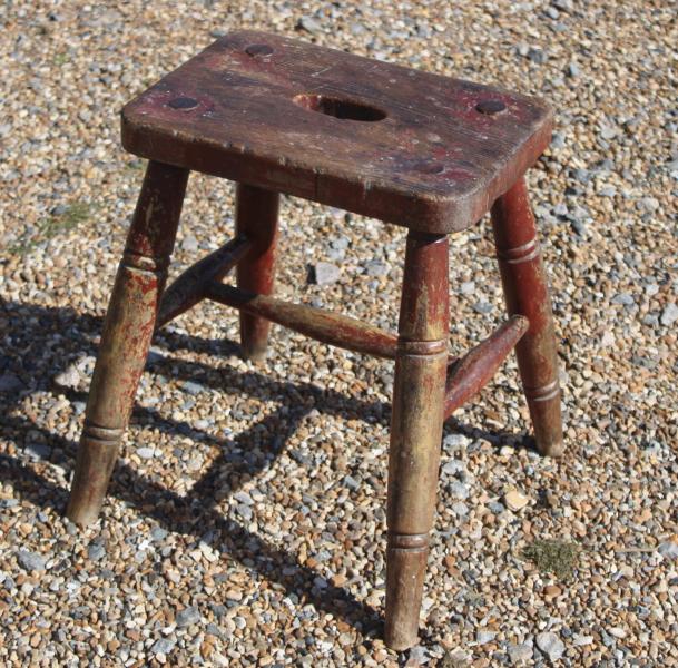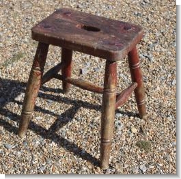 One of the best stools we have ever had. Great height, 18 inches ideal for next to the sofa, with the stability of its industrial heritage , it bears the owners / workshop brand C.I.A. / I.F that we have been unable to trace. The original paint red over yellow has been worn through to its oak carcass , used but not abused gives it a country / folk art vibe. |