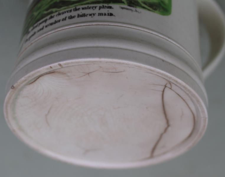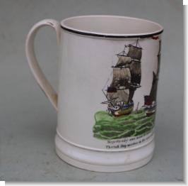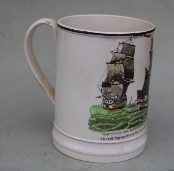 A wonderful early 19th century creamware tankard depicting three views of a ship in full sail above the verse....
