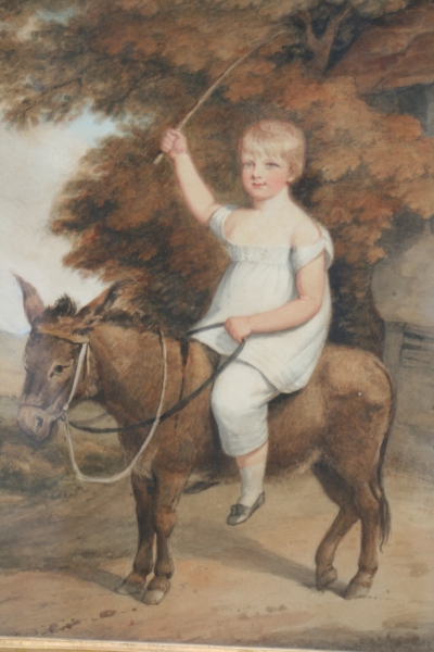 Large early 19th Century water colour of a young boy on the back of a donkey.